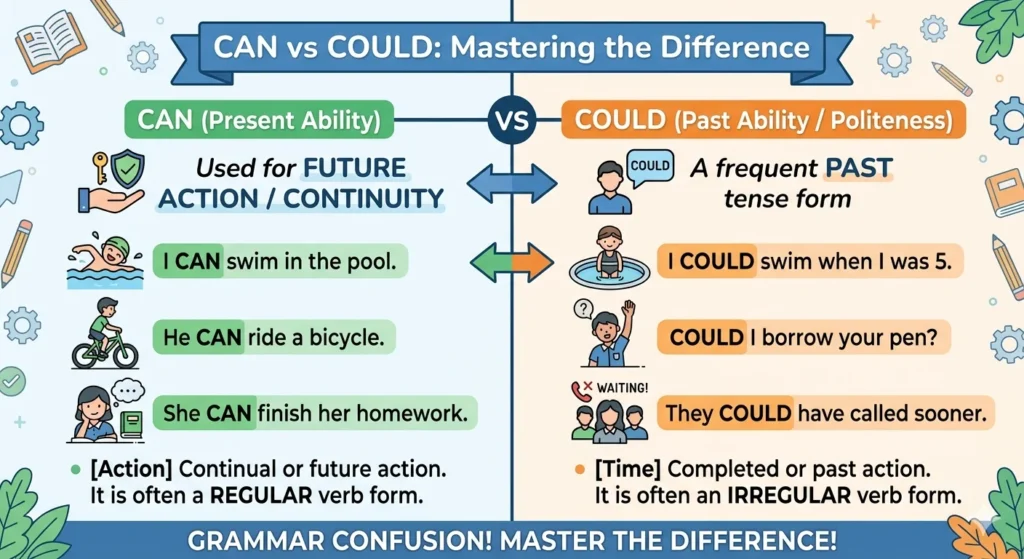 Understanding could vs can is simple when you focus on time, tone, and situation. Can is used for present ability and casual communication. Could is used for past ability, polite requests, and uncertain situations.